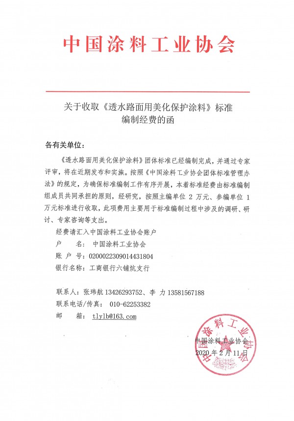 《透水路面用美化保护涂料》团体标准已经编制完成,并通过专家评审,将在近期发布和实施。按照《best365中国官方网站团体标准管理办法》的规定,为确保标准编制工作有序开展,本着标准经费由标准编制组成员共同承担的原则,经研究,按照主编单位2万元、参编单位1万元标准进行收取,此项费用主要用于标准编制过程中涉及的调研、研讨、专家咨询等支出。