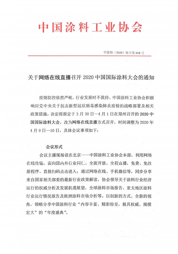 疫情防控依然严峻,行业发展时不我待。best365中国官方网站积极响应党中央关于抗击新型冠状病毒感染肺炎疫情的战略部署及相关政策措施,决定将原定于3月30日—4月1日在郑州召开的2020中国国际涂料大会,改为网络在线直播方式召开,时间调整为2020年4月9日—10日,具体会议事项如下: