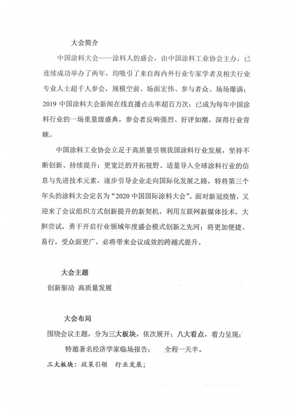 best365中国官方网站立足于高质量引领我国涂料行业发展,坚持不断创新、持续提升;更宽泛的开拓视野、适量导入全球涂料行业的信息与先进技术元素,逐步引导企业走向国际化发展之路,特将第三个年头的涂料大会定名为“2020中国国际涂料大会”。面对新冠疫情,又迎来了会议组织方式创新提升的新契机,利用互联网新媒体技术,大胆尝试,勇于开启行业领域年度盛会模式创新之先河;将更加便捷、易行,受众面更广,必将带来会议成效的跨越式提升。