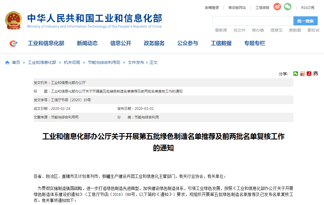 工信部办公厅2020年3月1日发布了《关于开展第五批绿色制造名单推荐及前两批名单复核工作的通知》(工信厅节函〔2020〕30号),要求各省工业和信息化主管部门、各有关行业协会按照《工业和信息化部办公厅关于开展绿色制造体系建设的通知》(工信厅节函〔2016〕586号)要求,开展第五批绿色制造名单推荐及已发布名单复核工作。