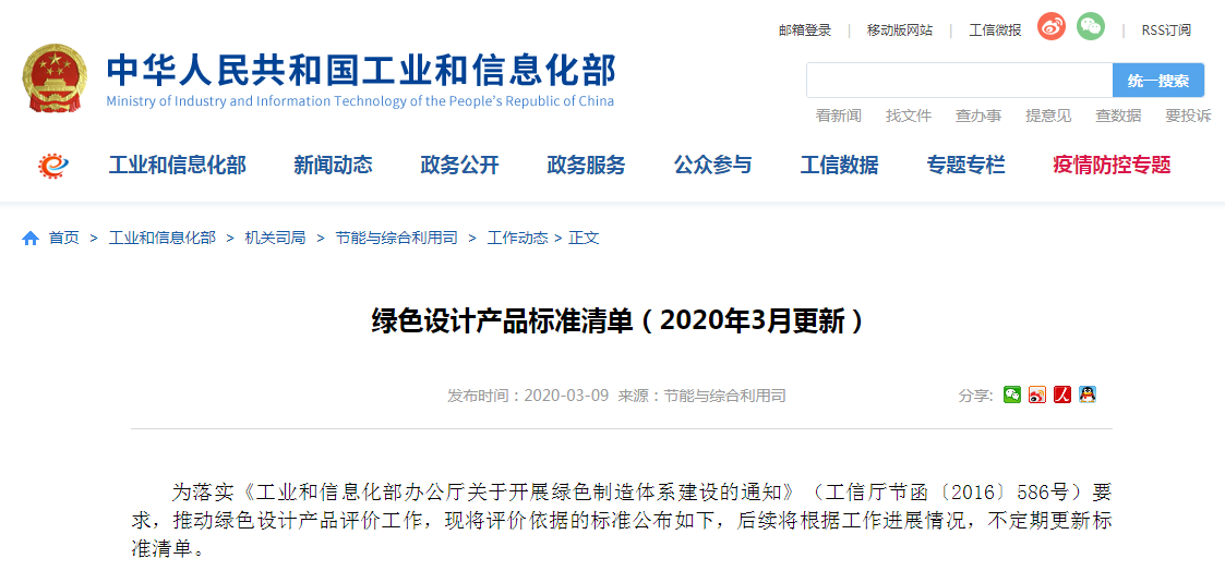 绿色设计产品标准清单(2020年3月更新)