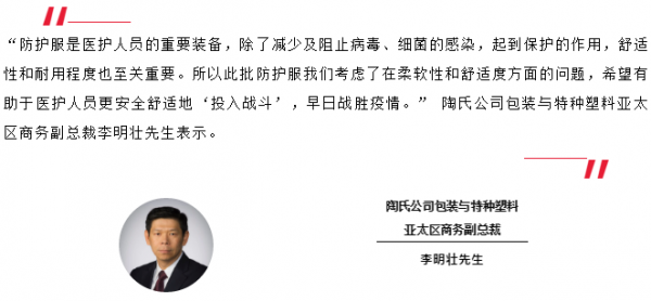 来自于陶氏公司的聚乙烯材料是防护服中透气膜的重要材料,并用于这批捐赠防护服的生产制造中。这批防护服是由合作伙伴——上海紫华企业有限公司生产制造。此次陶氏公司与紫华合力驰援,希望能够为一线医护工作者提供穿着更舒适、行动更方便且具有品质保障的“战服”。