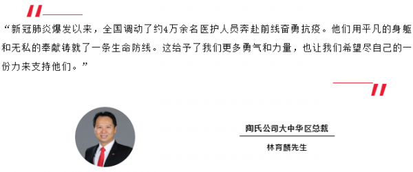 陶氏公司大中华区总裁林育麟先生出席了此次捐赠仪式并向奋战在一线的医护人员致敬。