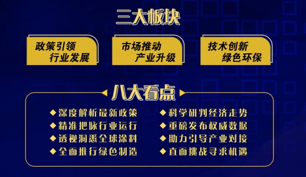 本届大会将围绕“创新驱动 高质量发展”为主题的主线,以“三大板块”依次展开,“八大看点”着力呈现,通过网络在线直播、手机微信等,同步分享来自国家相关部委的最新行业政策解读,著名经济学家的未来经济走势,协会关于涂料行业经济运行的权威分析及发展机遇展望,以及国际同行关于全球涂料市场报告、亚太地区涂料市场分析等。将以创新的方式、全新的视角,领略分享中国涂料行业“内容丰富、精彩纷呈,极具权威、规模宏大”的“年度盛典”!