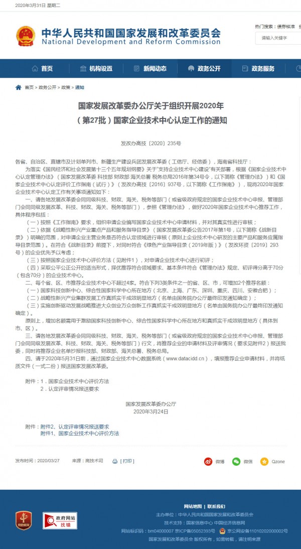 四、请于2020年5月31日前,通过国家企业技术中心数据系统(www.datacidd.cn),填报推荐企业申请材料,并将纸质文件(一式二份)报送国家发展改革委。