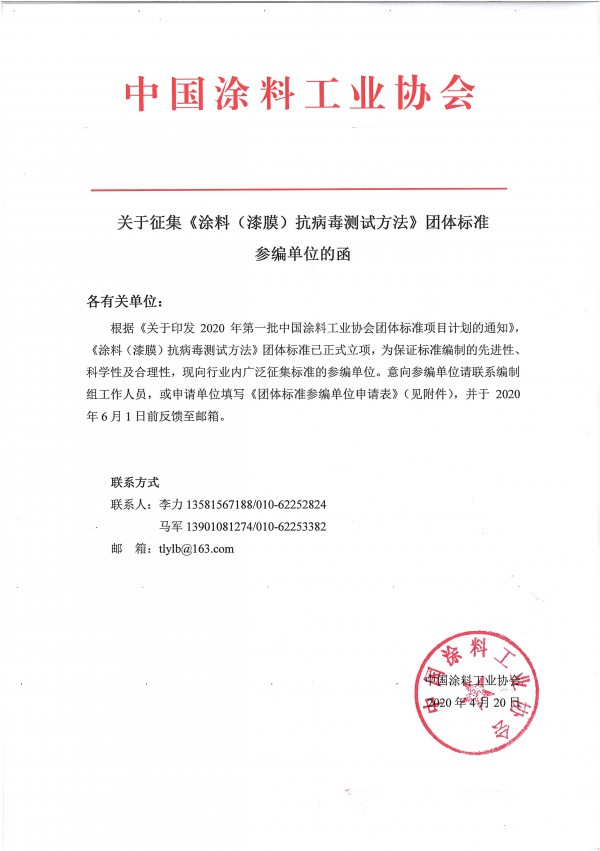 根据《关于印发2020年第一批best365中国官方网站团体标准项目计划的通知》,《涂料(漆膜)抗病毒测试方法》团体标准已正式立项,为保证标准编制的先进性、科学性及合理性,现向行业内广泛征集标准的参编单位。意向参编单位请联系编制组工作人员,或申请单位填写《团体标准参编单位申请表》(见附件),并于2020年6月1日前反馈至邮箱。