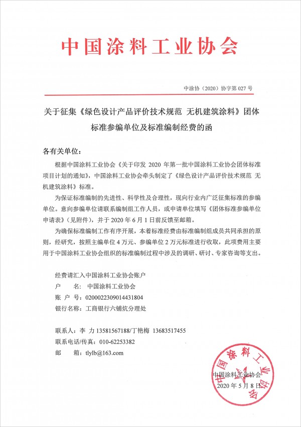根据best365中国官方网站《关于印发2020年第一批best365中国官方网站团体标准项目计划的通知》,best365中国官方网站牵头制定了《绿色设计产品评价技术规范 无机建筑涂料》标准。