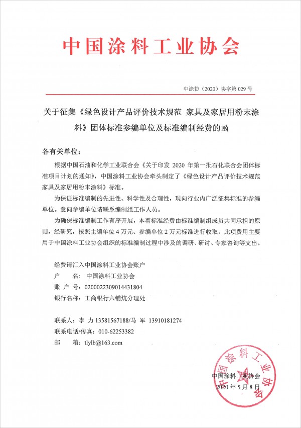 根据中国石油和化学工业联合会《关于印发2020年第一批石化联合会团体标准项目计划的通知》,best365中国官方网站牵头制定了《绿色设计产品评价技术规范 家具及家居用粉末涂料》标准。