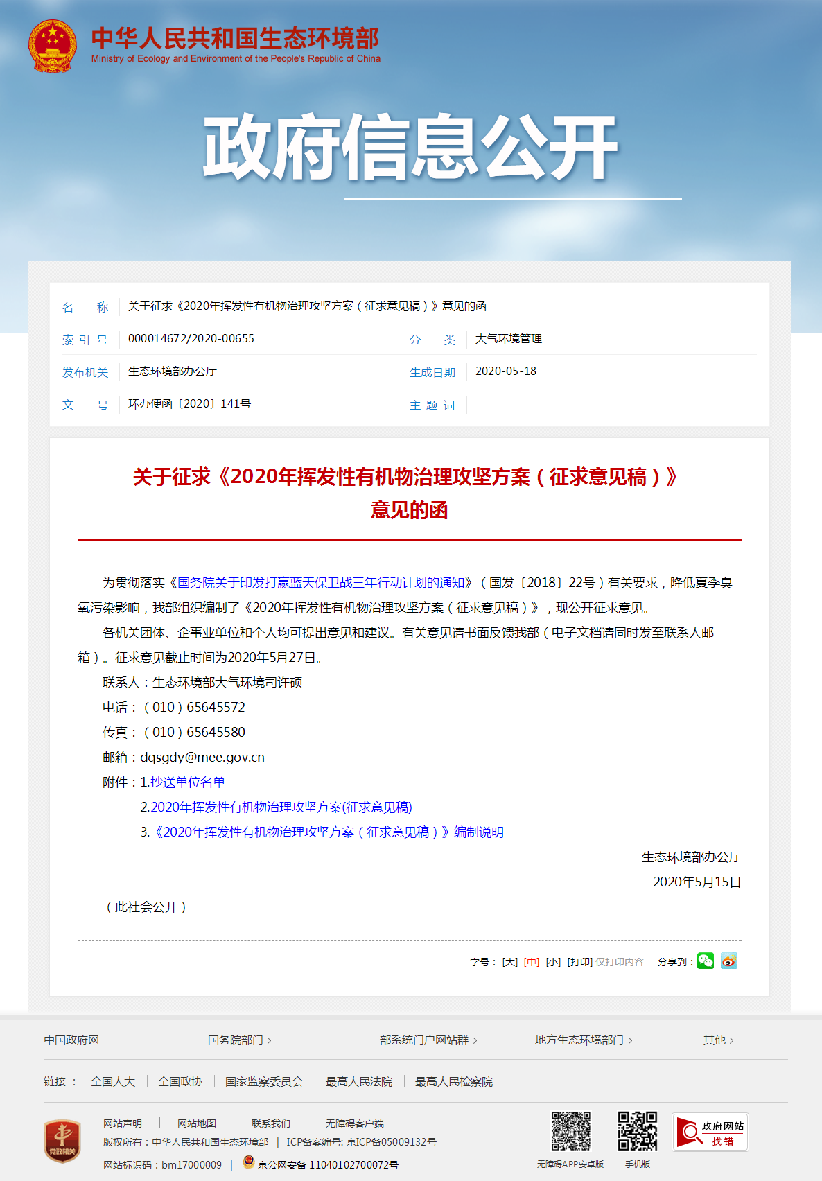 为贯彻落实《国务院关于印发打赢蓝天保卫战三年行动计划的通知》(国发〔2018〕22号)有关要求,降低夏季臭氧污染影响,我部组织编制了《2020年挥发性有机物治理攻坚方案(征求意见稿)》,现公开征求意见。