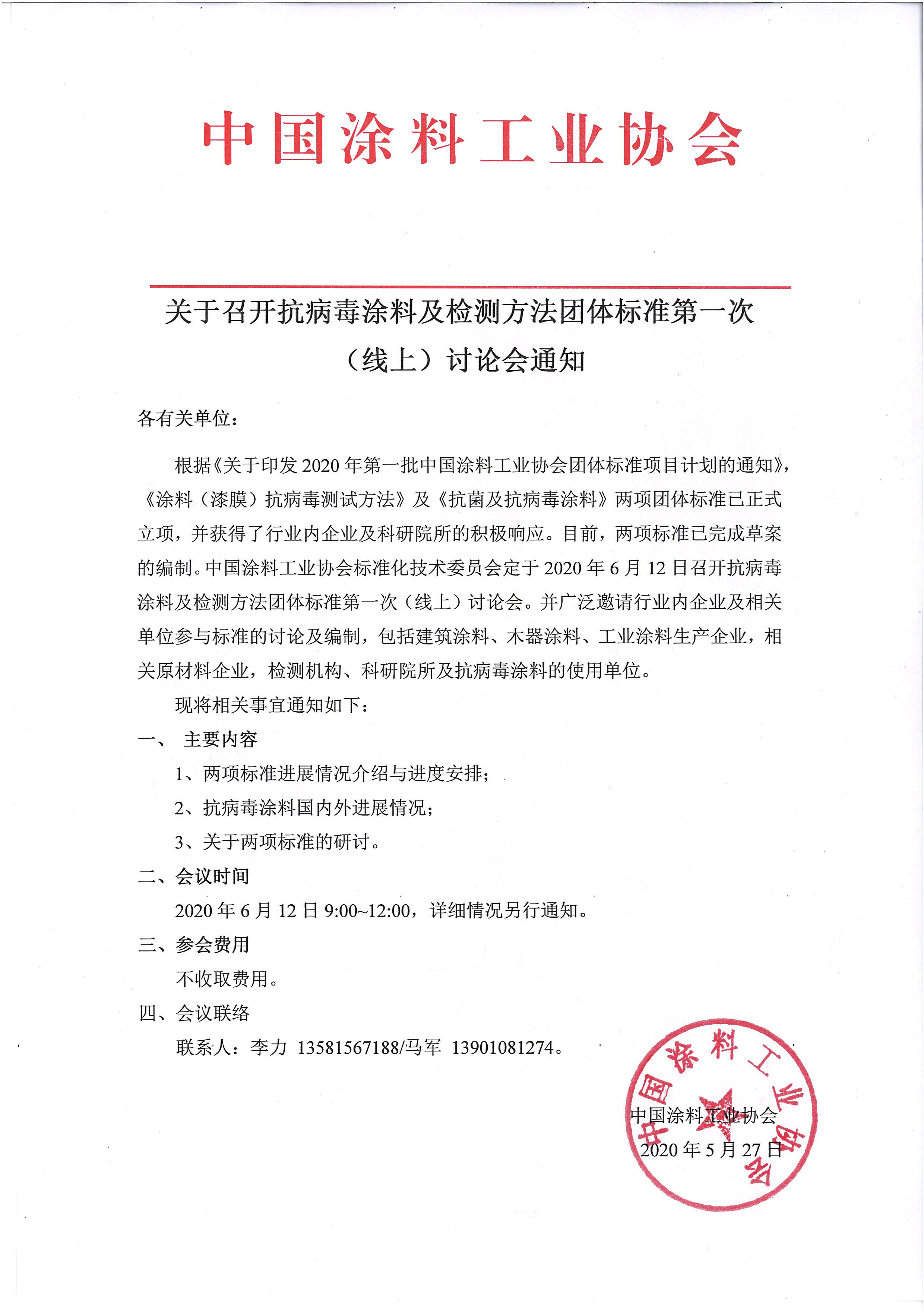 根据《关于印发2020年第一批best365中国官方网站团体标准项目计划的通知》,《涂料(漆膜)抗病毒测试方法》及《抗菌及抗病毒涂料》两项团体标准已正式立项,并获得了行业内企业及科研院所的积极响应。目前,两项标准已完成草案的编制。best365中国官方网站标准化技术委员会定于2020年6月12日召开抗病毒涂料及检测方法团体标准第一次(线上)讨论会。并广泛邀请行业内企业及相关单位参与标准的讨论及编制,包括建筑涂料、木器涂料、工业涂料生产企业,相关原材料企业,检测机构、科研院所及抗病毒涂料的使用单位。
