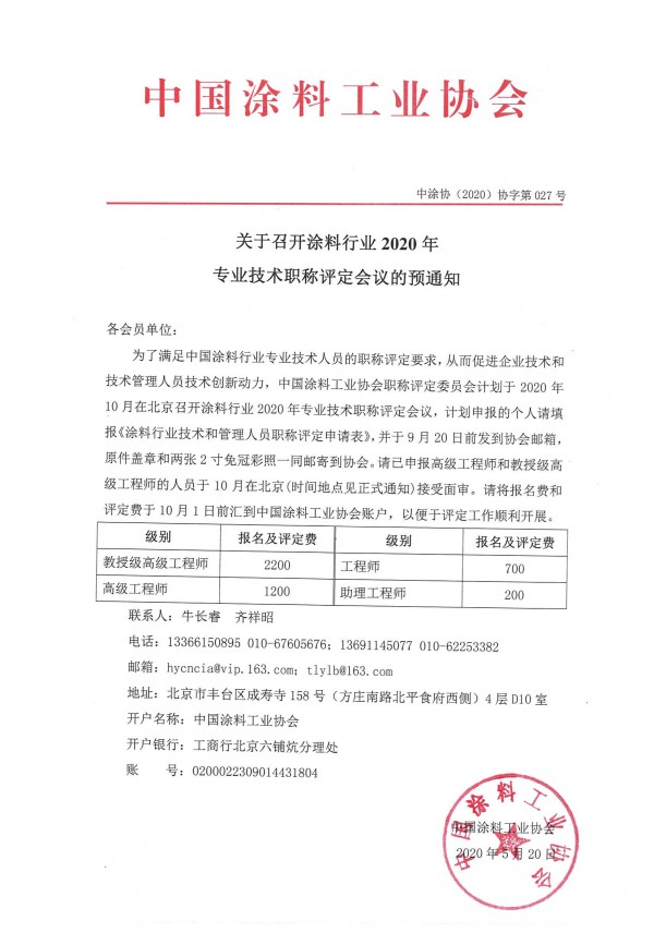为了满足中国涂料行业专业技术人员的职称评定要求,从而促进企业技术和技术管理人员技术创新动力,best365中国官方网站职称评定委员会计划于2020年10月在北京召开涂料行业2020年专业技术职称评定会议,计划申报的个人请填报《涂料行业技术和管理人员职称评定申请表》,并于9月20日前发到协会邮箱,原件盖章和两张2寸免冠彩照一同邮寄到协会。请已申报高级工程师和教授级高级工程师的人员于10月在北京(时间地点请关注正式通知)接受面审。请将报名费和评定费于10月1日前汇到best365中国官方网站账户,以便于评定工作顺利开展。