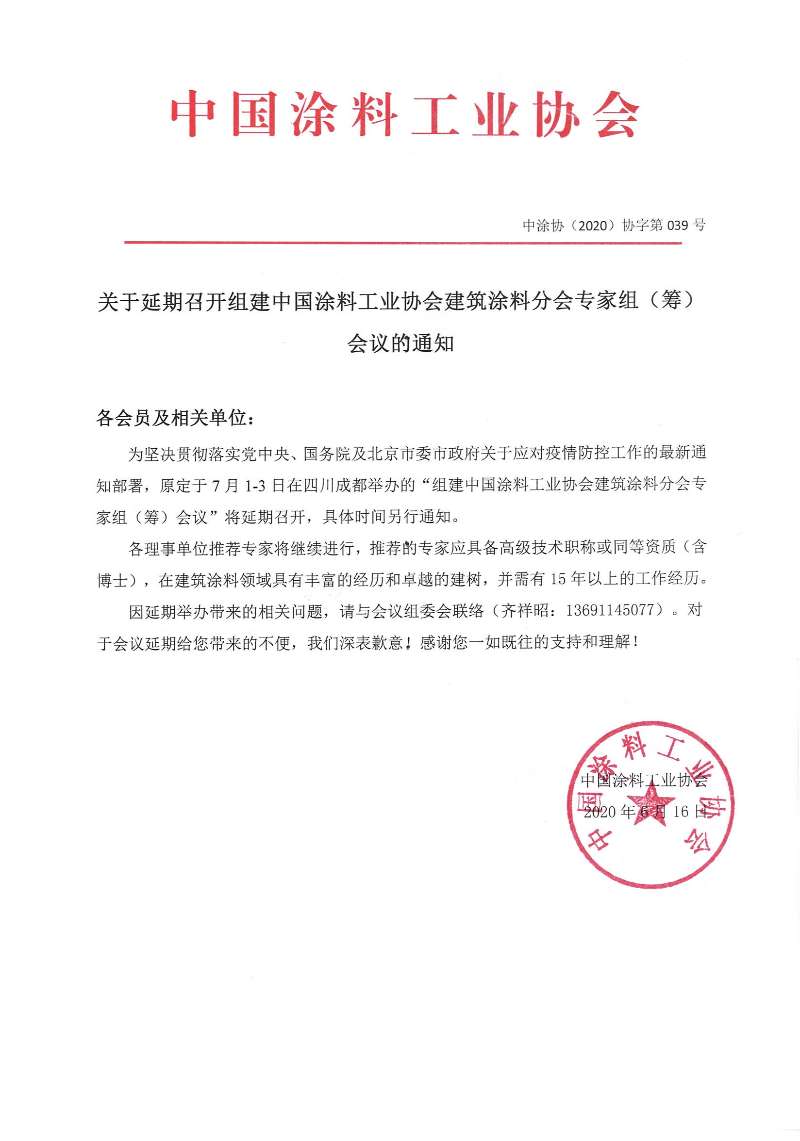 为坚决贯彻落实党中央、国务院及北京市委市政府关于应对疫情防控工作的最新通知部署,原定于7月1-3日在四川成都举办的“组建best365中国官方网站建筑涂料分会专家组(筹)会议”将延期召开,具体时间另行通知。