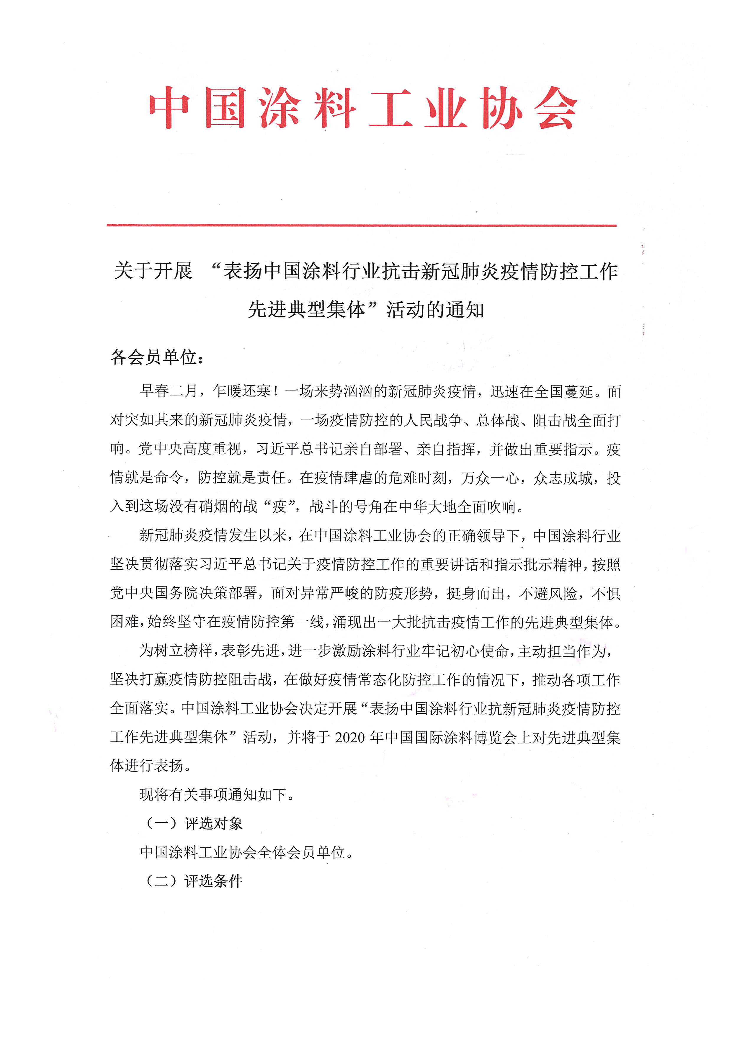 为树立榜样,表彰先进,进一步激励涂料行业牢记初心使命,主动担当作为,坚决打赢疫情防控阻击战,在做好疫情常态化防控工作的情况下,推动各项工作全面落实。best365中国官方网站决定开展“表扬中国涂料行业抗新冠肺炎疫情防控工作先进典型集体”活动,并将于2020年中国国际涂料博览会上对先进典型集体进行表扬。