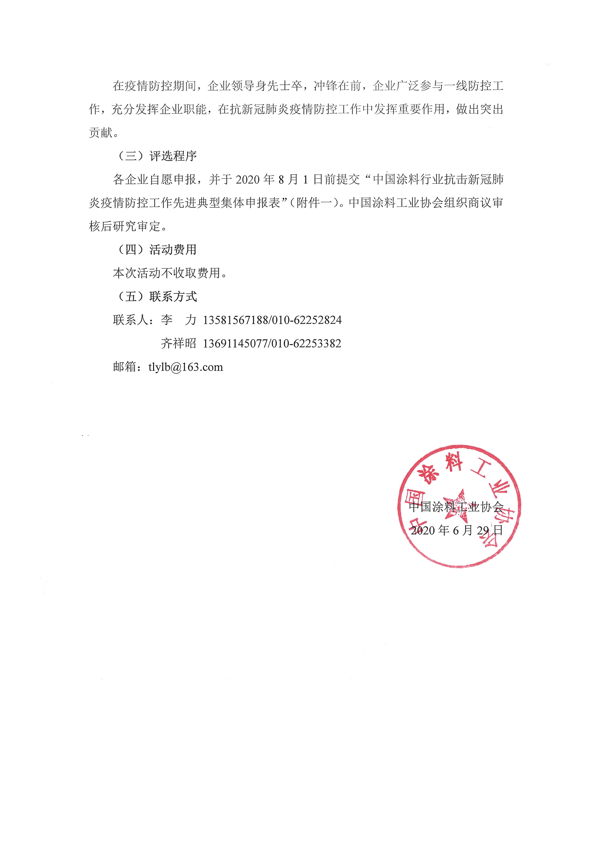 各企业自愿申报,并于2020年8月1日前提交“中国涂料行业抗击新冠肺炎疫情防控工作先进典型集体申报表”(附件一)。best365中国官方网站组织商议审核后研究审定。