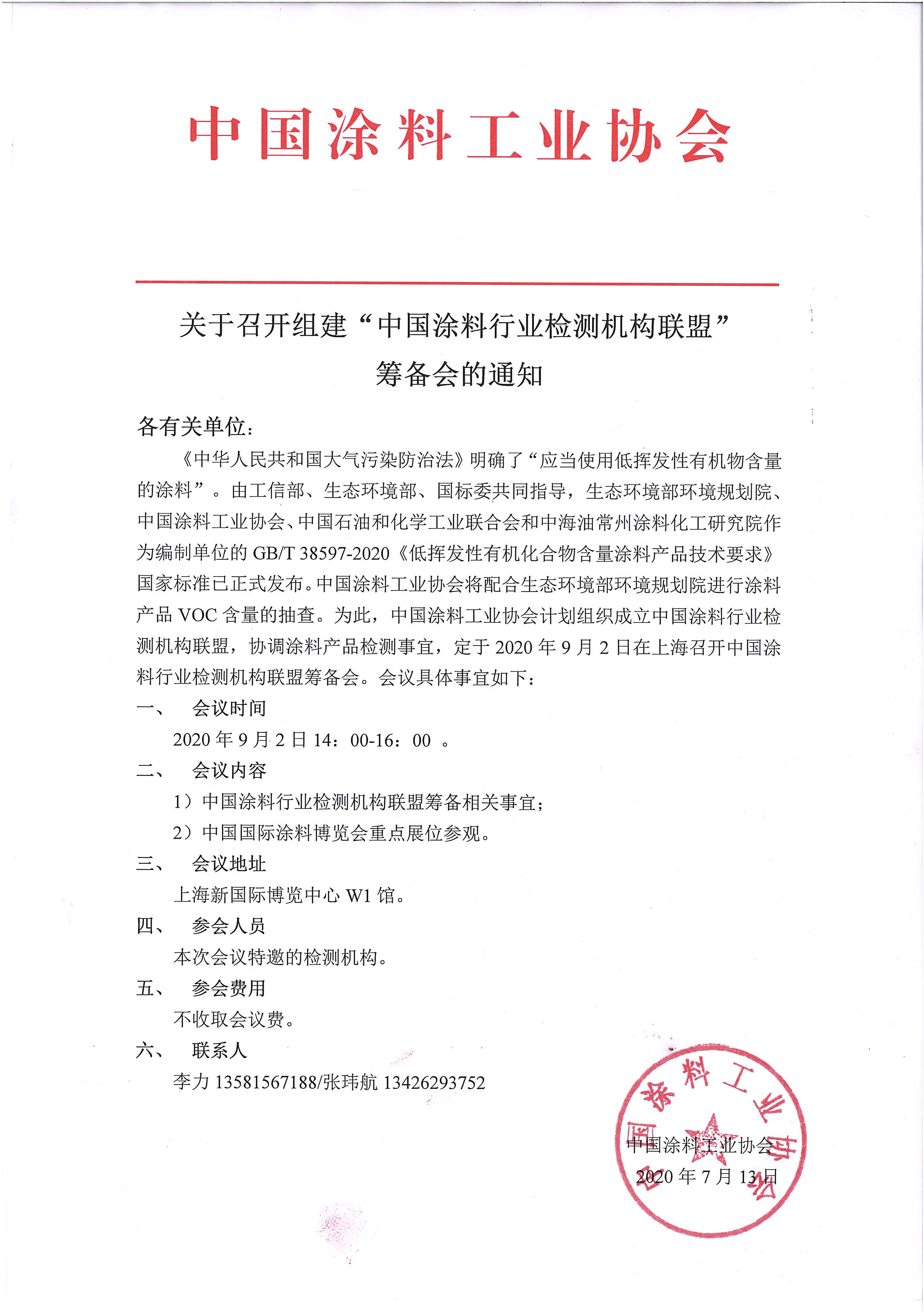 《中华人民共和国大气污染防治法》明确了“应当使用低挥发性有机物含量的涂料”。由工信部、生态环境部、国标委共同指导,生态环境部环境规划院、best365中国官方网站、中国石油和化学工业联合会和中海油常州涂料化工研究院作为编制单位的GB/T 38597-2020《低挥发性有机化合物含量涂料产品技术要求》国家标准已正式发布。best365中国官方网站将配合生态环境部环境规划院进行涂料产品VOC含量的抽查。为此,best365中国官方网站计划组织成立中国涂料行业检测机构联盟,协调涂料产品检测事宜,定于2020年9月2日在上海召开中国涂料行业检测机构联盟筹备会。会议具体事宜如下: