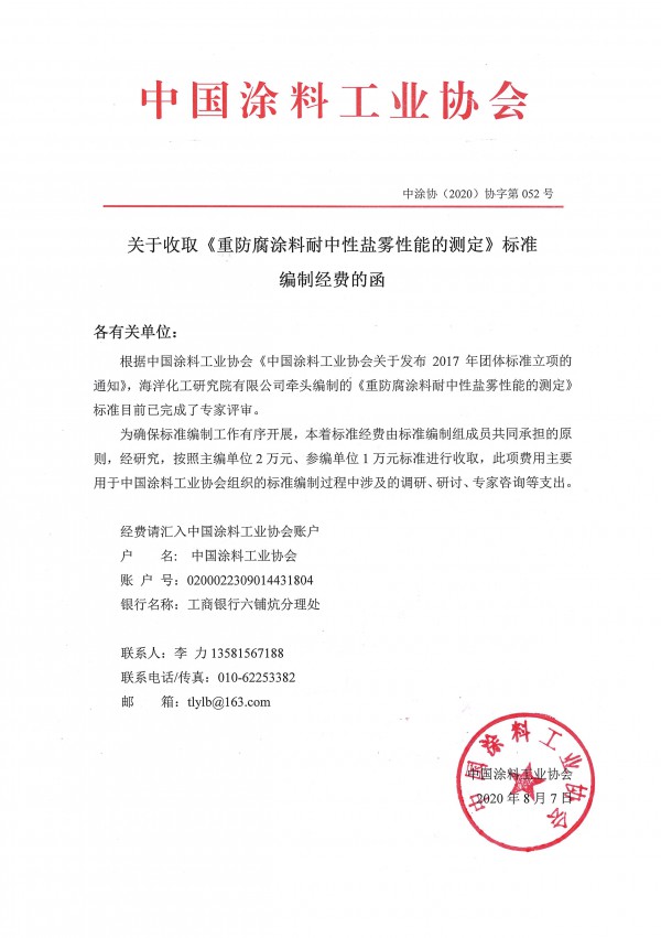 根据best365中国官方网站《best365中国官方网站关于发布2017年团体标准立项的通知》,海洋化工研究院有限公司牵头编制的《重防腐涂料耐中性盐雾性能的测定》标准目前已完成了专家评审。