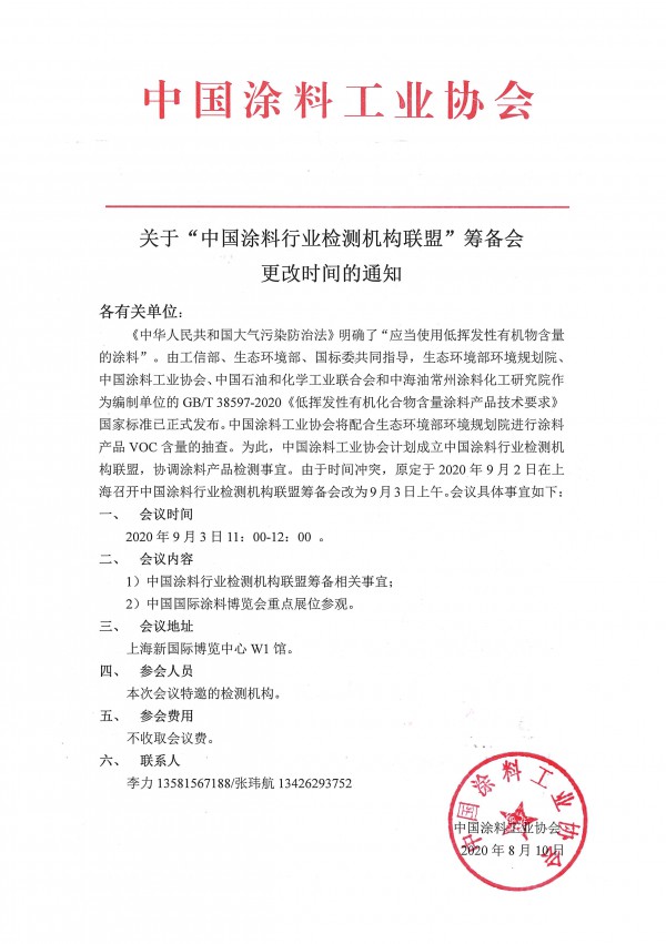 《中华人民共和国大气污染防治法》明确了“应当使用低挥发性有机物含量的涂料”。由工信部、生态环境部、国标委共同指导,生态环境部环境规划院、best365中国官方网站、中国石油和化学工业联合会和中海油常州涂料化工研究院作为编制单位的GB/T38597-2020《低挥发性有机化合物含量涂料产品技术要求》国家标准已正式发布。best365中国官方网站将配合生态环境部环境规划院进行涂料产品VOC含量的抽查。为此,best365中国官方网站计划成立中国涂料行业检测机构联盟,协调涂料产品检测事宜。由于时间冲突,原定于2020年9月2日在上海召开中国涂料行业检测机构联盟筹备会改为9月3日上午。会议具体事宜如下: