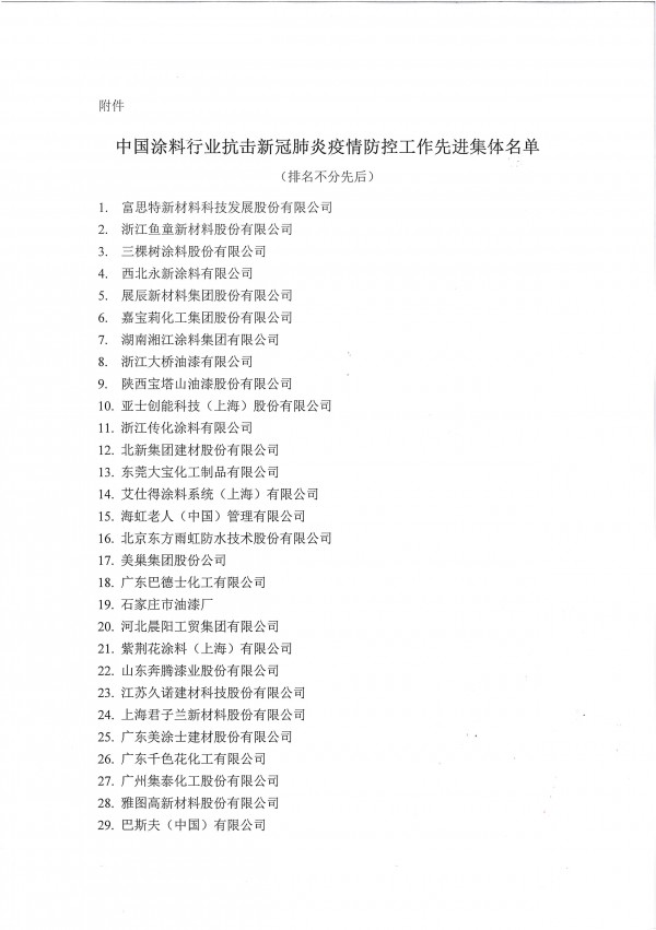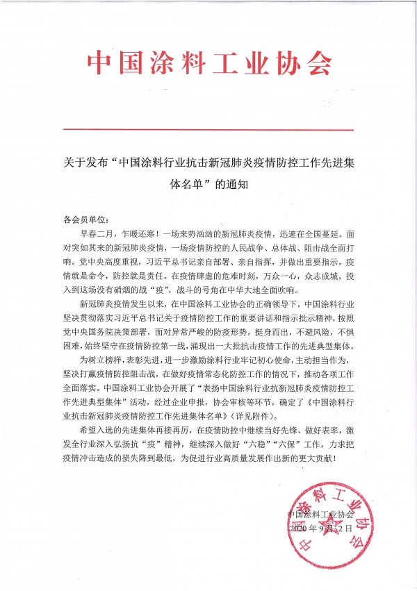 为树立榜样,表彰先进,进一步激励涂料行业牢记初心使命,主动担当作为,坚决打赢疫情防控阻击战,在做好疫情常态化防控工作的情况下,推动各项工作全面落实。best365中国官方网站开展了“表扬中国涂料行业抗新冠肺炎疫情防控工作先进典型集体”活动,经过企业申报,协会审核等环节,确定了《中国涂料行业抗击新冠肺炎疫情防控工作先进集体名单》(详见附件)。