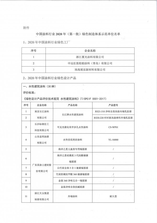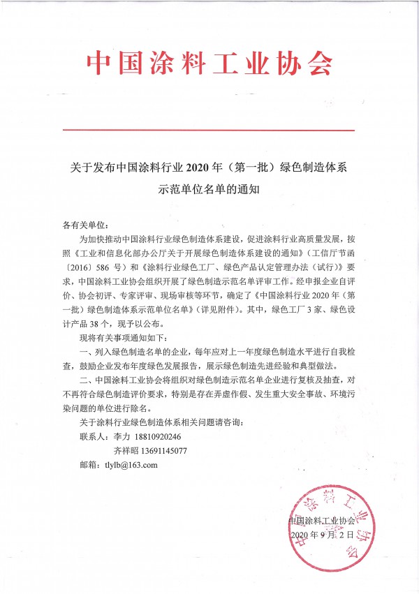 为加快推动中国涂料行业绿色制造体系建设,促进涂料行业高质量发展,按照《工业和信息化部办公厅关于开展绿色制造体系建设的通知》(工信厅节函〔2016〕586号)和《涂料行业绿色工厂、绿色产品认定管理办法(试行)》要求,best365中国官方网站组织开展了绿色制造示范名单评审工作。经申报企业自评价、协会初评、专家评审、现场审核等环节,确定了《中国涂料行业2020年(第一批)绿色制造体系示范单位名单》(详见附件)。其中,绿色工厂3家、绿色设计产品38个,现予以公布。