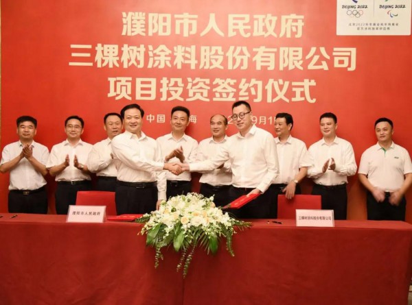 9月1日,濮阳市人民政府与三棵树涂料股份有限公司项目投资签约仪式在上海市举行。市长杨青玖,副市长张宏义,三棵树涂料股份有限公司董事长、总裁洪杰,副总裁林德殿等出席签约仪式。