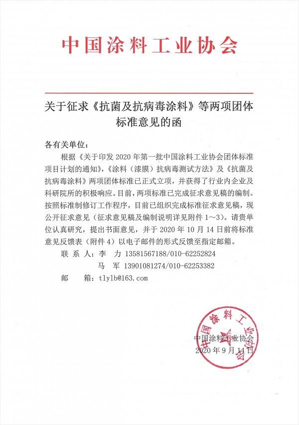 根据《关于印发2020年第一批best365中国官方网站团体标准项目计划的通知》,《涂料(漆膜)抗病毒测试方法》及《抗菌及抗病毒涂料》两项团体标准已正式立项,并获得了行业内企业及科研院所的积极响应。目前,两项标准已完成征求意见稿的编制。按照标准制修订工作程序,目前已组织完成标准征求意见稿,现公开征求意见(征求意见稿及编制说明详见附件1~3)。请贵单位认真研究,提出书面意见,并于2020年10月14日前将标准意见反馈表(附件4)以电子邮件的形式反馈至指定邮箱。