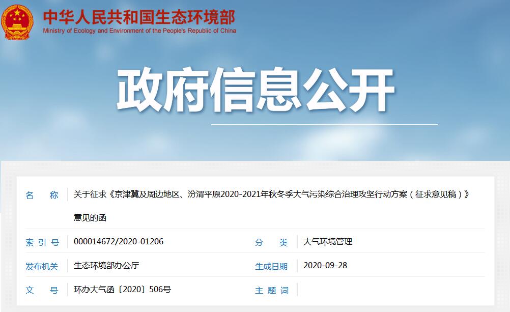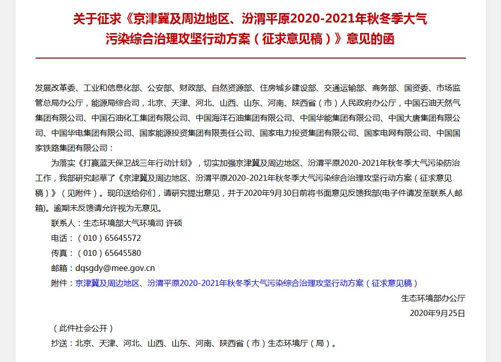 为落实《打赢蓝天保卫战三年行动计划》,切实加强京津冀及周边地区、汾渭平原2020-2021年秋冬季大气污染防治工作,我部研究起草了《京津冀及周边地区、汾渭平原2020-2021年秋冬季大气污染综合治理攻坚行动方案(征求意见稿)》(见附件)。现印送给你们,请研究提出意见,并于2020年9月30日前将书面意见反馈我部(电子件请发至联系人邮箱)。逾期未反馈请允许视为无意见。