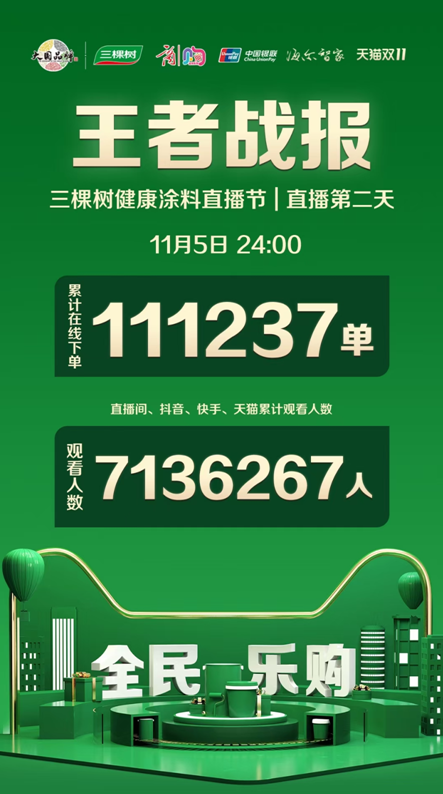 2020年11月4日-5日,备受行业瞩目的三棵树健康涂料直播节圆满举行。本次活动属于行业内参与人数多、合作伙伴广、规模大、销售量高的消费者直播活动,受到各级政府领导、行业领导、合作伙伴和明星大咖多方资源加持助力。截止11月5日晚24:00,最终累计以线上观看人数7136267人次、全网获取订单量111237单,突破10个亿销售额的成绩完美收官。