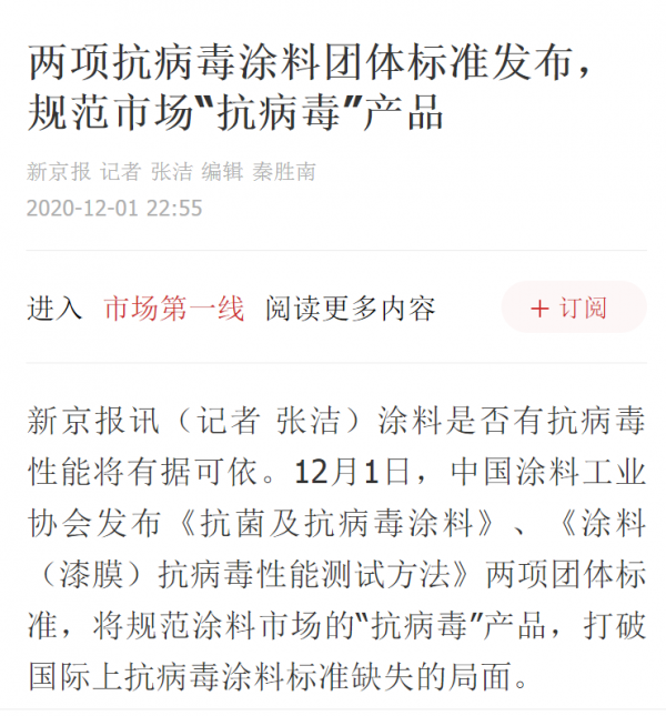 新京报:两项抗病毒涂料团体标准发布,规范市场“抗病毒”产品