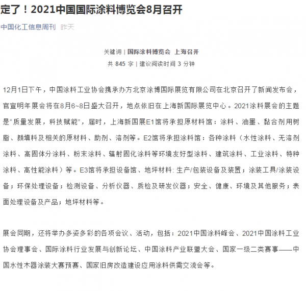 中国化工信息周刊:定了!2021中国国际涂料博览会8月召开