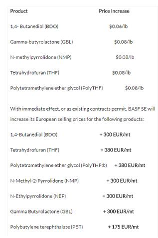 巴斯夫宣布从2021年1月1日开始,或者在现有合同允许的情况下,巴斯夫将提高北美1,4-丁二醇(BDO)及其衍生物的价格。