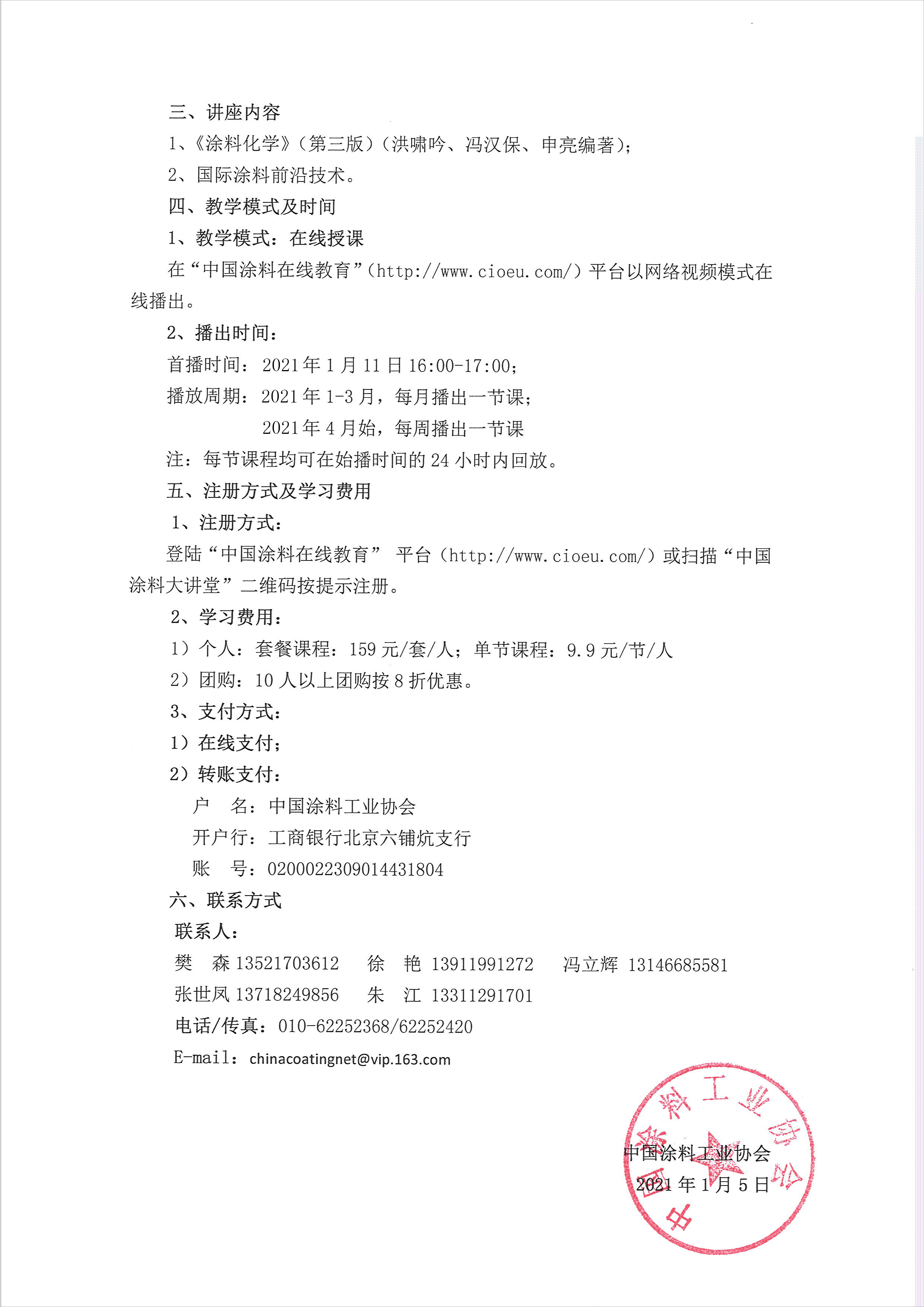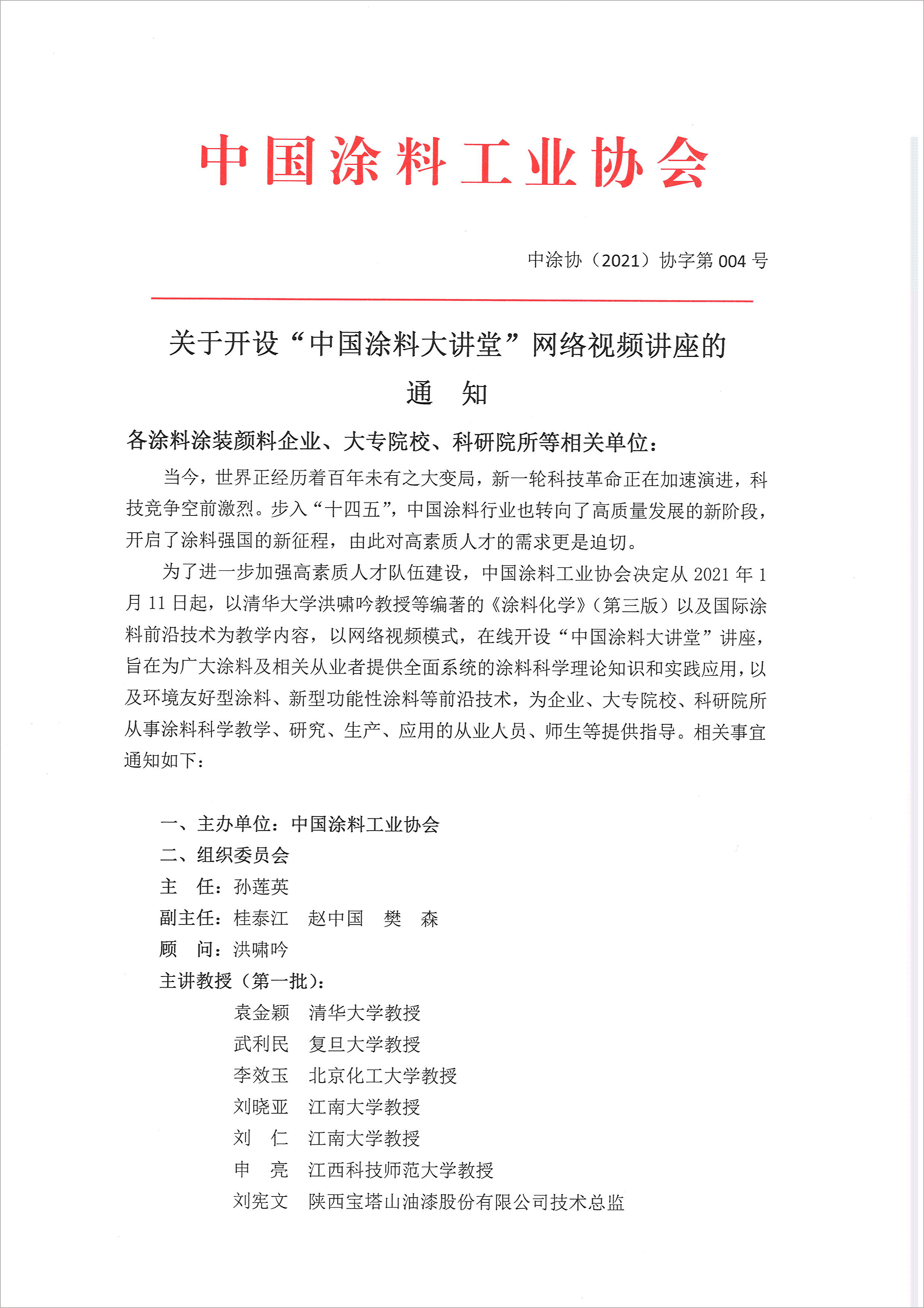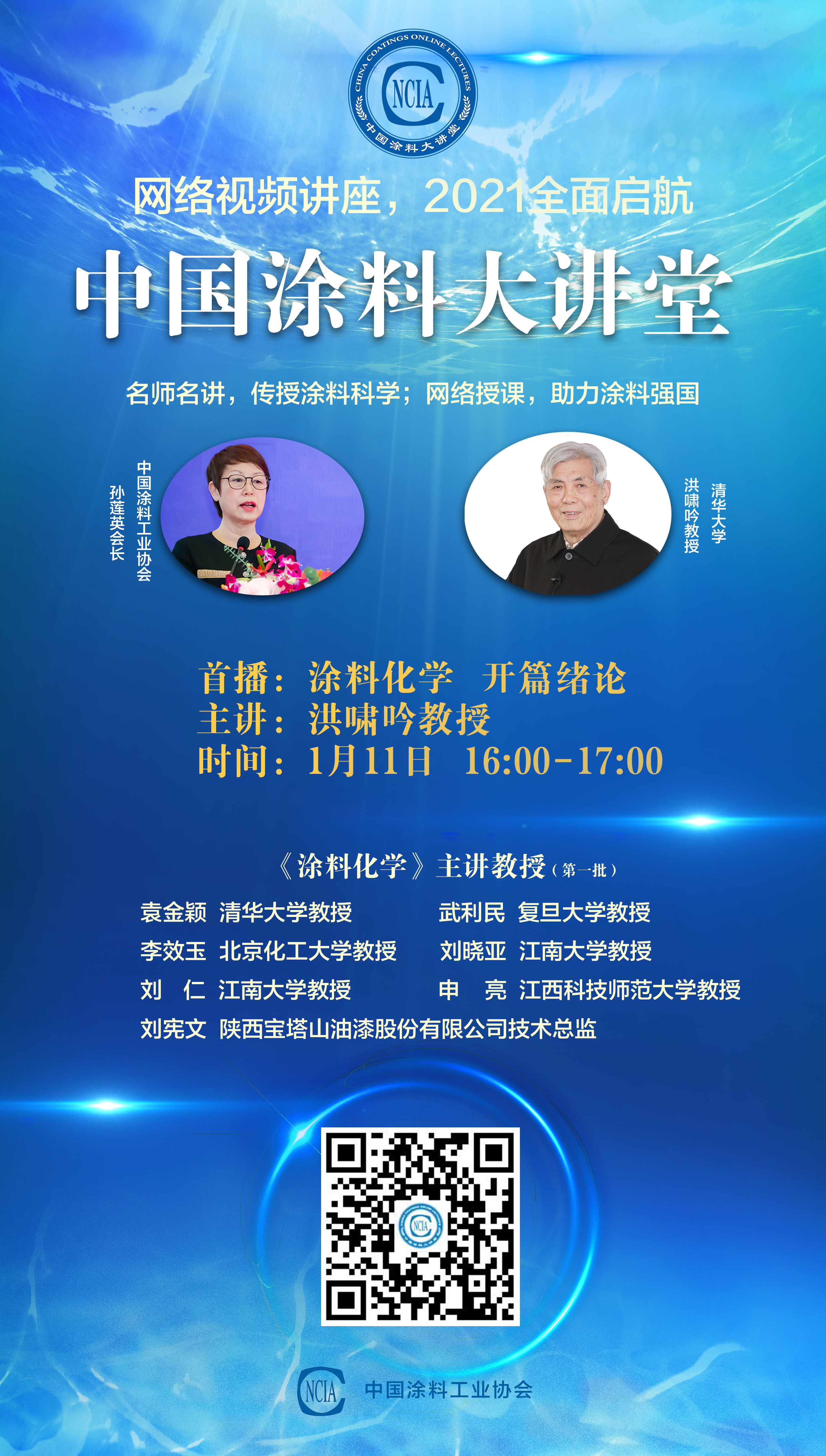 为了进一步加强高素质人才队伍建设,best365中国官方网站决定从2021年1月11日起,以清华大学洪啸吟教授等编著的《涂料化学》(第三版)以及国际涂料前沿技术为教学内容,以网络视频模式,在线开设“中国涂料大讲堂”讲座,旨在为广大涂料及相关从业者提供全面系统的涂料科学理论知识和实践应用,以及环境友好型涂料、新型功能性涂料等前沿技术,为企业、大专院校、科研院所从事涂料科学教学、研究、生产、应用的从业人员、师生等提供指导。相关事宜通知如下: