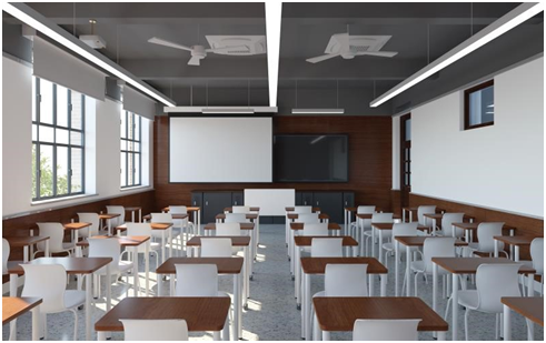 采用褐色无醛板墙面饰面以及褐色无醛板课桌面板的同济大学智慧教室