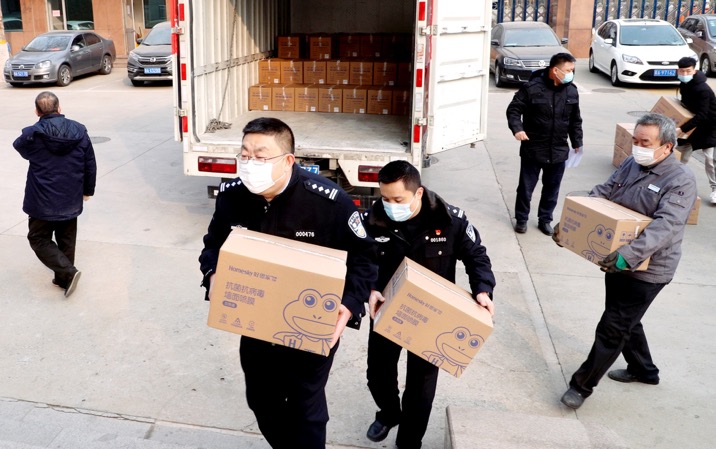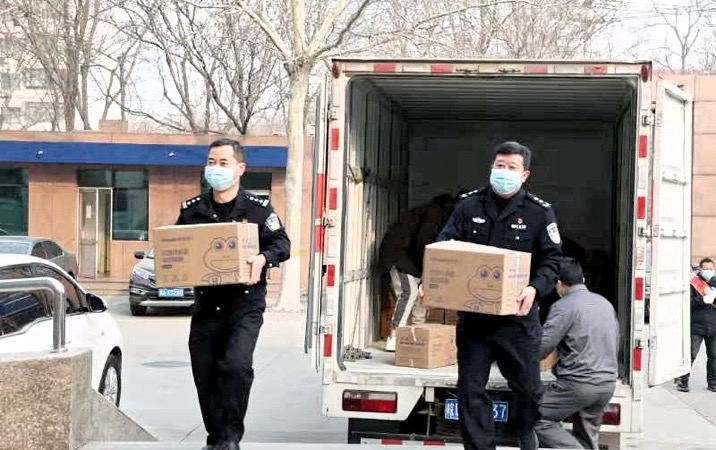 捐赠现场民警同志搬运抗菌抗病毒喷膜