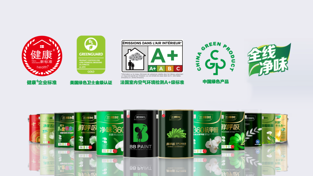 三棵树在行业率先提出“健康+”企业标准,其中乳胶漆产品的VOC指标约为国标指标的1/10;游离甲醛为国标的1/10,达到食品接触级标准;创造了8小时净味住新家和全线净味的行业先例;并首创绿色建筑美学,让建筑成为风景。三棵树以超越国家绿色产品标准和欧美环保标准的技术指标,研发生产了8000多支产品,通过绿色建材一站式集成系统和美好生活解决方案,以“创新+服务”双轮驱动,为用户健康美好生活保驾护航,为建设美丽中国、净味中国贡献力量。