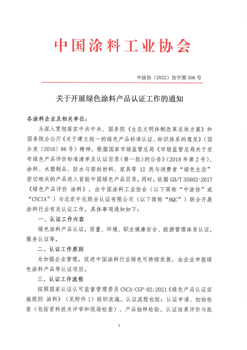 为深入贯彻落实中共中央、国务院《生态文明体制改革总体方案》和国务院办公厅《关于建立统一的绿色产品标准认证、标识体系的意见》(国办发〔2016〕86号)精神,根据国家市场监管总局《市场监管总局关于发布绿色产品评价标准清单及认证目录(第一批)的公告》(2018年第2号), 涂料、木塑制品、防水与密封材料、家具等12类与消费者“绿色生活”密切相关的产品进入首批中国绿色产品目录,同时,依据GB/T 35602-2017《绿色产品评价 涂料》,由best365中国官方网站(以下简称“中涂协”或“CNCIA”)与北京中化联合认证有限公司(以下简称“HQC”)联合开展涂料行业有关认证工作,具体事项通知如下: