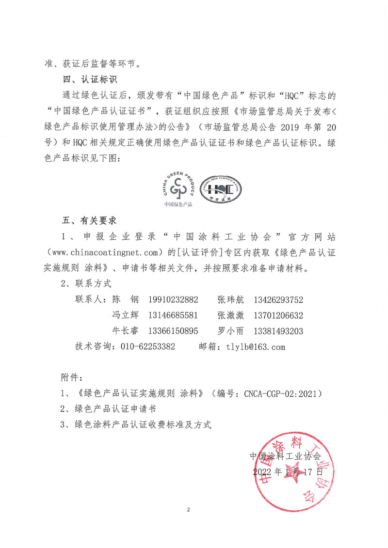 为加强企业管理,促进中国涂料行业绿色可持续发展,由企业申报绿色涂料产品等认证项目。