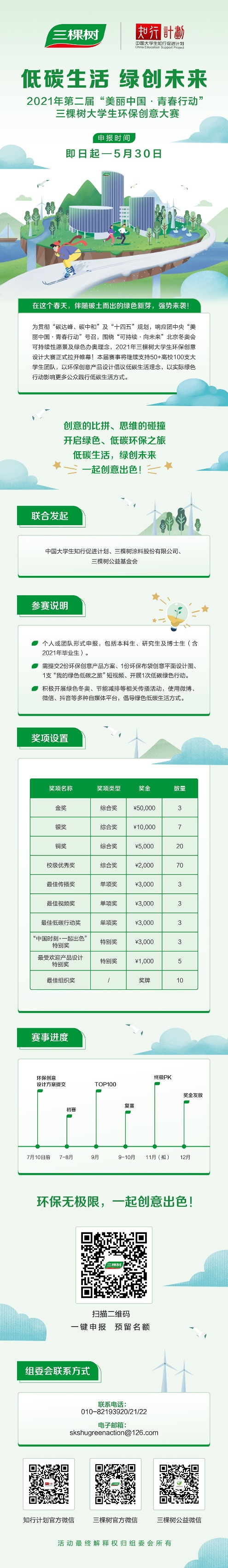 为响应共青团中央“美丽中国·青春行动”号召,贯彻“碳达峰、碳中和”及“十四五”规划,2021年三棵树再度携手中国大学生知行促进计划(简称“知行计划”),发起第二届“美丽中国·青春行动”三棵树大学生环保创意大赛。创意大赛作为知行计划核心项目之一,将持续支持并鼓励全国的大学生发挥想象力和创新力,通过设计环保创意产品倡导低碳生活理念,以绿色行动带动更多人选择低碳生活方式。
