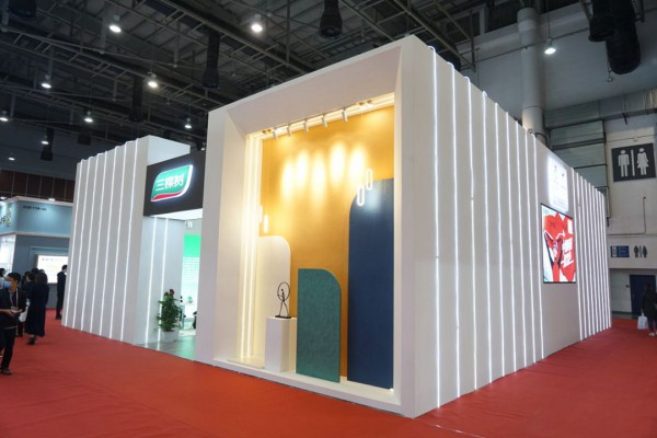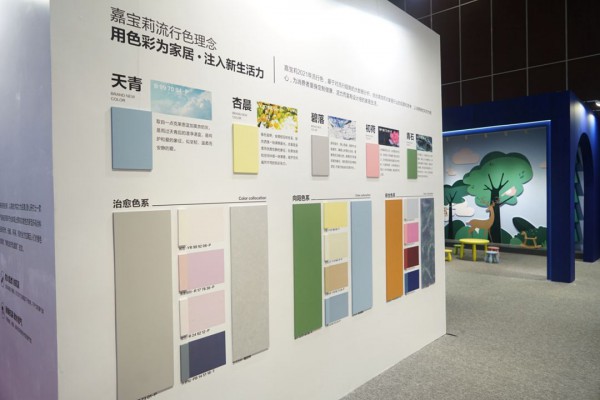 嘉宝莉此次展位外墙设计延续深圳展的白房子设计灵感,以几何美学为灵感,展位通过涂料构建视觉艺术的几何体,为人们呈现一个活力多元、富有设计感的几何意象空间。嘉宝莉在展会期间展示了建筑涂料、艺术涂料、BB氧吧抗病毒儿童墙面漆和2021空间流行色趋势等展示区域。以不同的几何色块、线条贯穿整个展位内墙,打破沉闷的展示方式。
