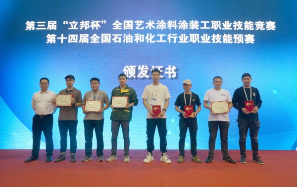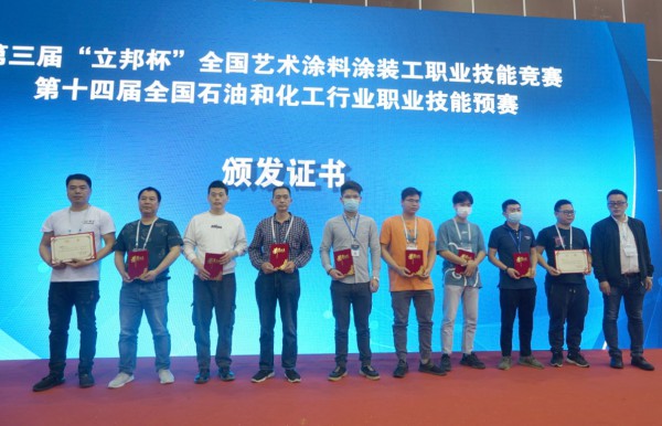 获得第三届“立邦杯”全国艺术涂料涂装工职业技能竞赛艺术涂料优秀墙艺师称号的是:杨文轩、郭立新、黄显富、陈炎坤、陈成业、李泽锋、罗志坤、陆国贤、黄致萍、肖伟斌。奖项由吴清涛颁发。
