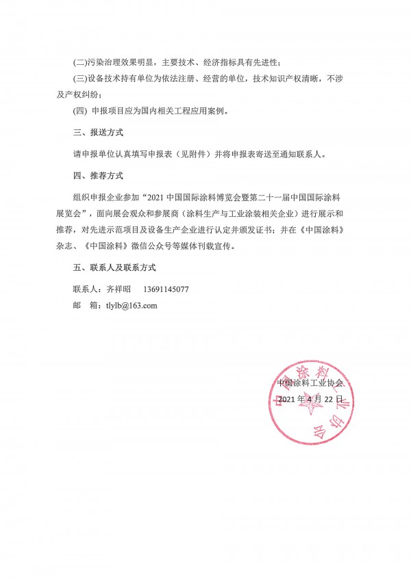 组织申报企业参加“2021中国国际涂料博览会暨第二十一届中国国际涂料展览会”,面向展会观众和参展商(涂料生产与工业涂装相关企业)进行展示和推荐,对先进示范项目及设备生产企业进行认定并颁发证书;并在《中国涂料》杂志、《中国涂料》微信公众号等媒体刊载宣传。