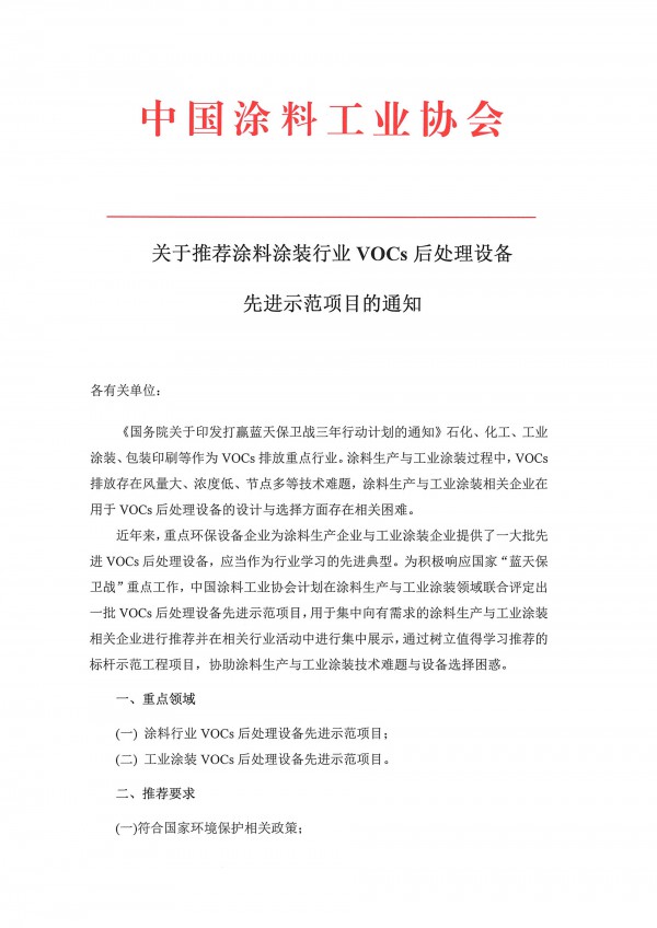 关于推荐涂料工业VOCs后处理先进示范装备的通知 |