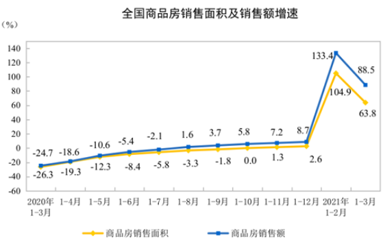 在商品房销售和待售方面,1—3月份,商品房销售面积36007万平方米,同比增长63.8%;比2019年1—3月份增长20.7%,两年平均增长9.9%。其中,住宅销售面积增长68.1%,办公楼销售面积增长34.4%,商业营业用房销售面积增长24.9%。商品房销售额38378亿元,增长88.5%;比2019年1—3月份增长41.9%,两年平均增长19.1%。其中,住宅销售额增长95.5%,办公楼销售额增长44.0%,商业营业用房销售额增长25.8%。