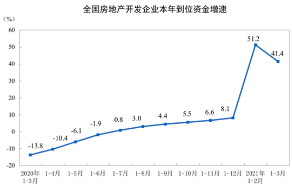 在房地产开发企业到位资金方面,数据显示,1—3月份,房地产开发企业到位资金47465亿元,同比增长41.4%;比2019年1—3月份增长21.9%,两年平均增长10.4%。其中,国内贷款7222亿元,增长7.5%;利用外资11亿元,下降41.0%;自筹资金13015亿元,增长21.0%;定金及预收款17759亿元,增长86.1%;个人按揭贷款7843亿元,增长50.0%。