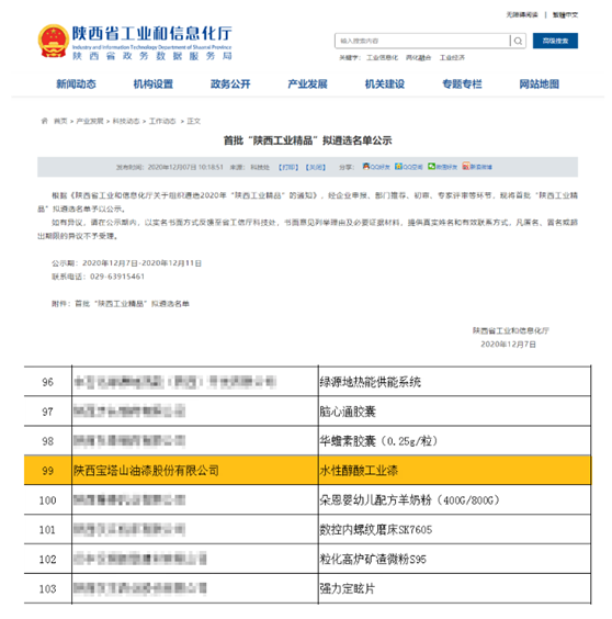 据2020年12月7日首届“陕西工业精品”拟遴选名单公布显示,公司水性醇酸工业漆产品早已实力上榜。