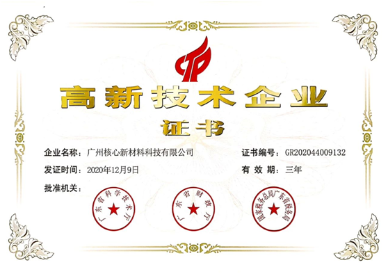 根据国家《高新技术企业认定管理办法》和《高新技术企业认定管理工作指引》的相关规定,核心化学凭借专业的研发队伍、雄厚的技术实力、持续的创新能力、科学的企业管理,被顺利认定为高新技术企业,可喜可贺!