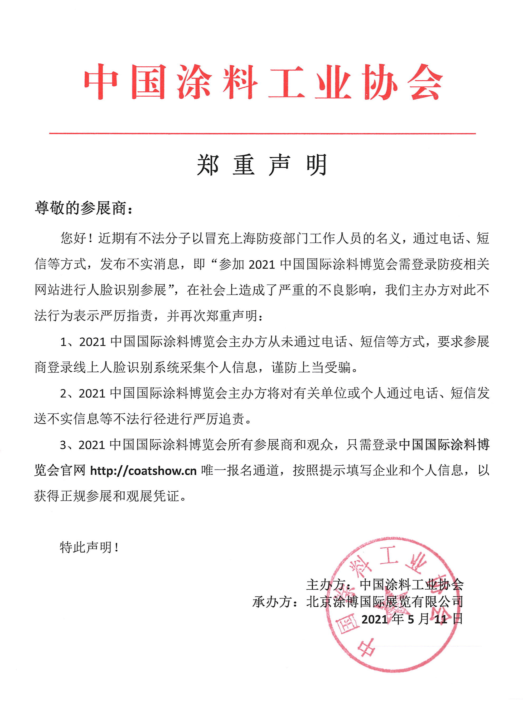 您好!近期有不法分子以冒充上海防疫部门工作人员的名义,通过电话、短信等方式,发布不实消息,即“参加2021中国国际涂料博览会需登录防疫相关网站进行人脸识别参展”,在社会上造成了严重的不良影响,我们主办方对此不法行为表示严厉指责,并再次郑重声明:
