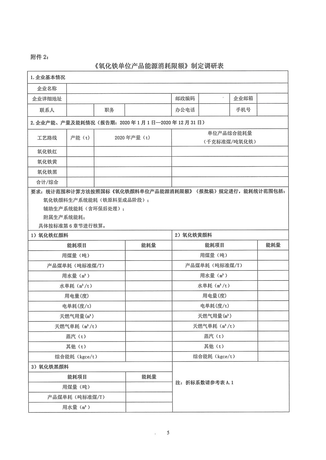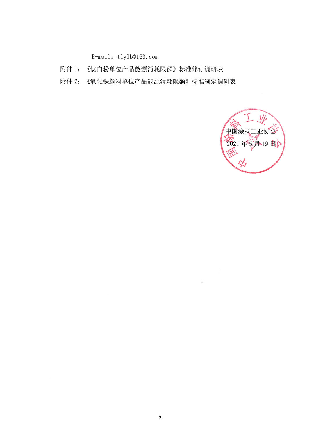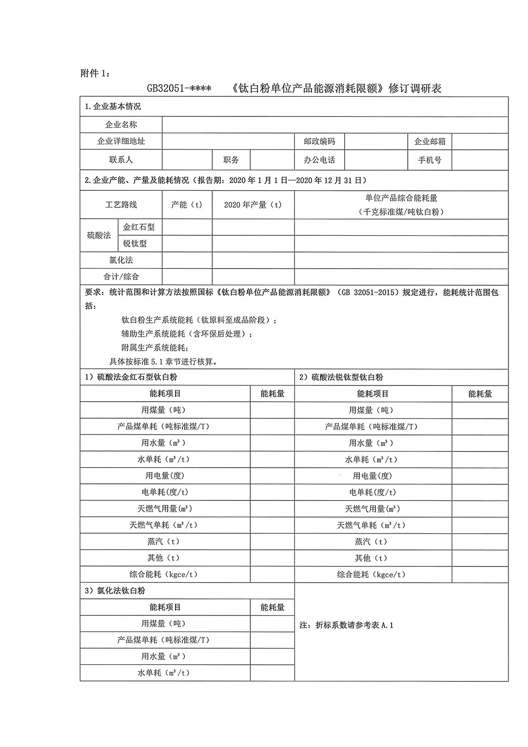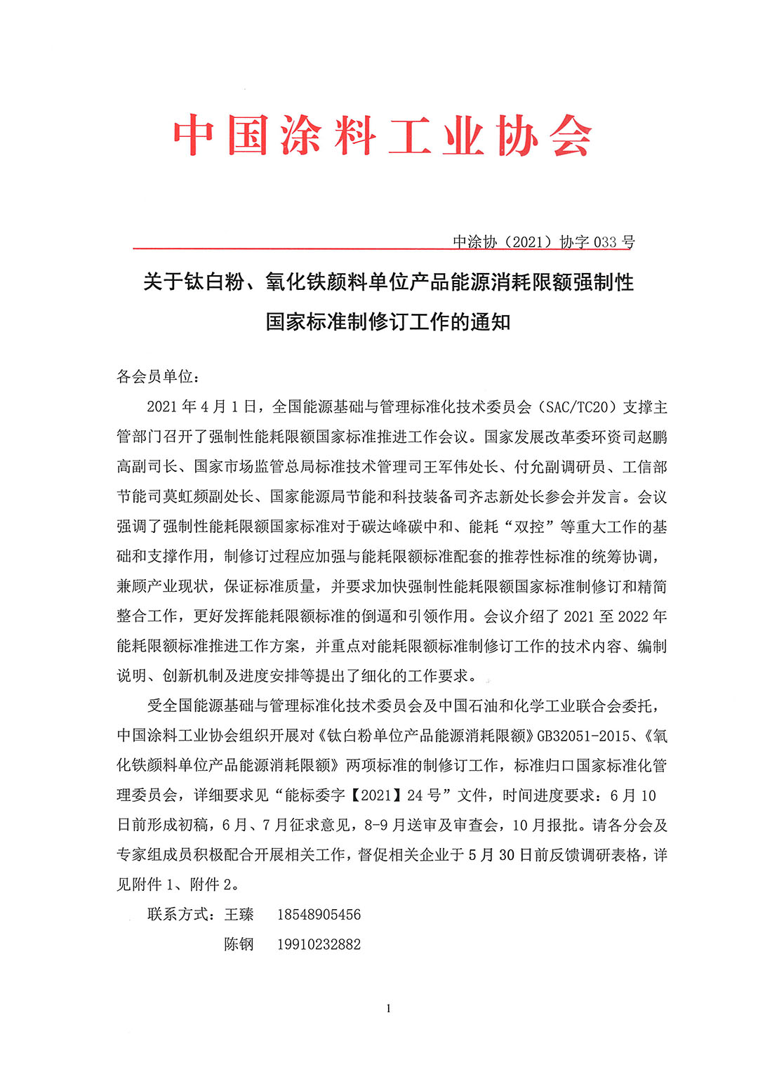 受全国能源基础与管理标准化技术委员会及中国石油和化学工业联合会委托,best365中国官方网站组织开展对《钛白粉单位产品能源消耗限额》GB32051-2015、《氧化铁颜料单位产品能源消耗限额》两项标准的制修订工作,标准归口国家标准化管理委员会,详细要求见“能标委字【2021】24号”文件,时间进度要求:6月10日前形成初稿,6月、7月征求意见,8-9月送审及审查会,10月报批。请各分会及专家组成员积极配合开展相关工作,督促相关企业于5月30日前反馈调研表格,详见附件1、附件2。