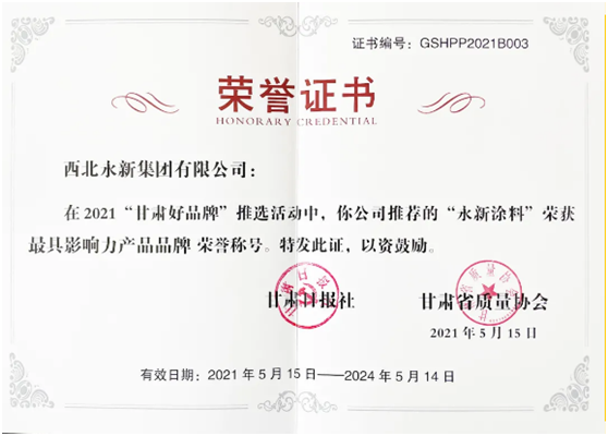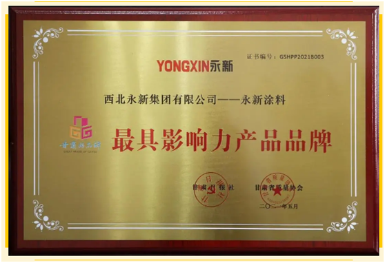 5月15日,在由省委宣传部、省发改委、省工信厅、省农业农村厅、省商务厅、省市场监督局指导,甘肃日报社、甘肃省质量协会联合主办第二届甘肃品牌论坛上,西北永新集团“永新涂料”荣获“甘肃好品牌——最具影响力产品品牌”称号。