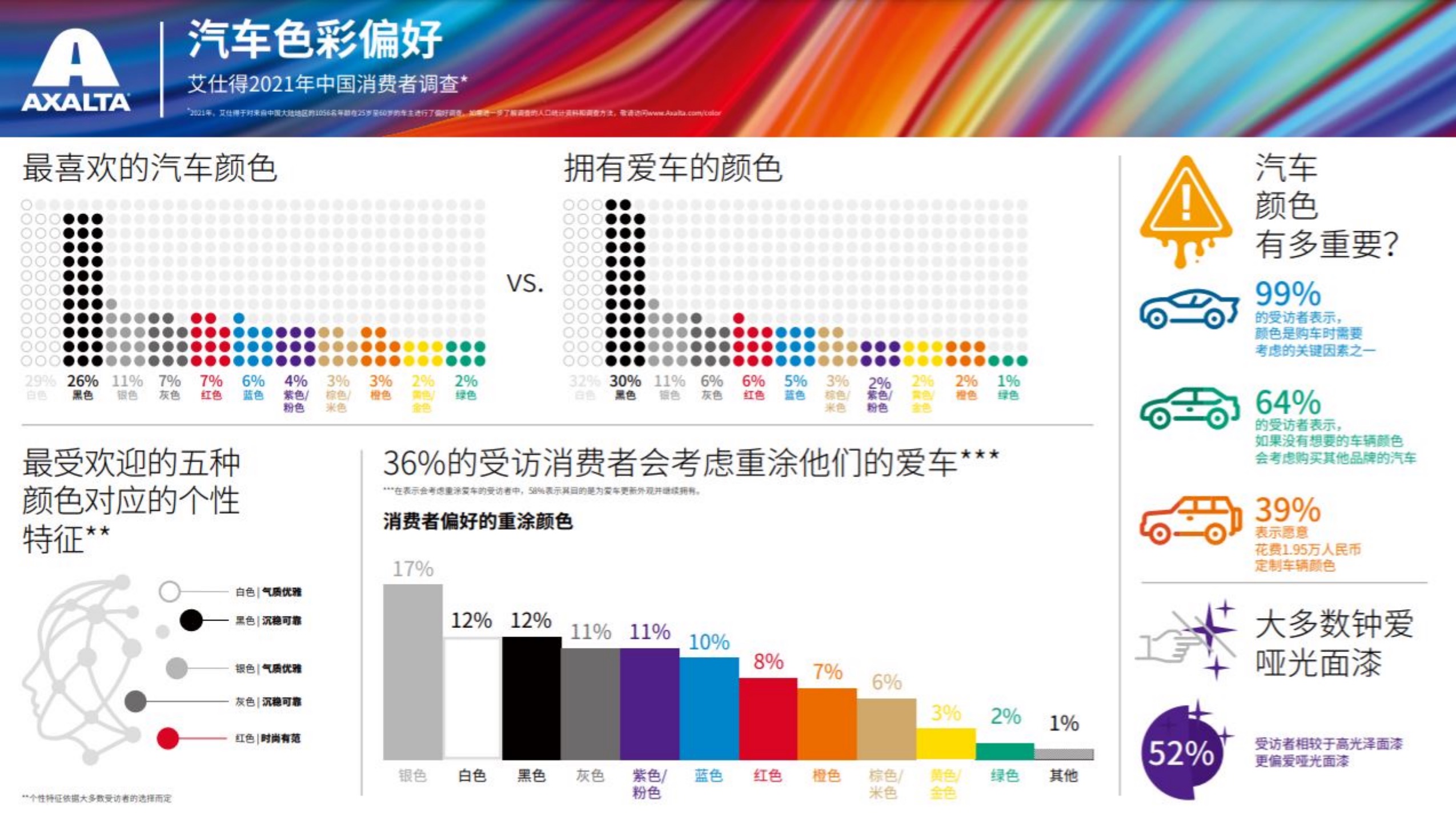 与其他各国消费者相比,中国消费者的汽车色彩选择相对保守,但另一方面,调查也显示有36%的中国车主愿意尝试新的汽车色彩,他们的主要目的在于赋予车辆崭新面貌。