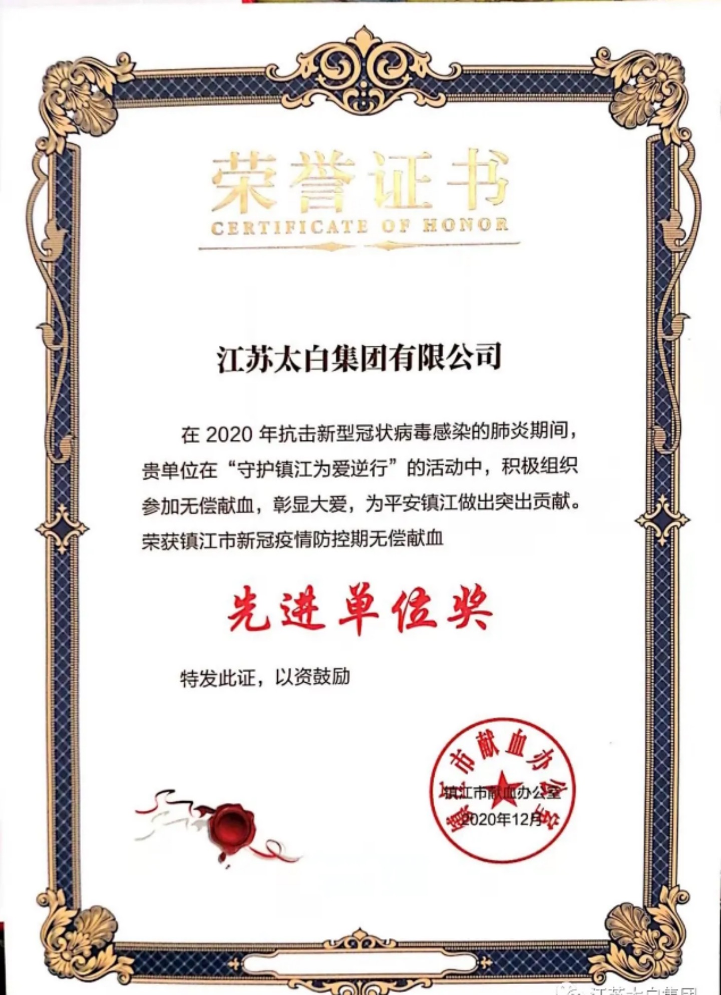 江苏太白集团有限公司一向高度重视无偿献血工作,多次配合镇江市中心血站开展无偿献血宣传活动,连续多年荣获“无偿献血先进单位”的荣誉称号。江苏太白集团将继续发扬成绩,示范和带动更多的团体和个人参与无偿献血活动,为全市无偿献血公益事业做出更大的贡献。